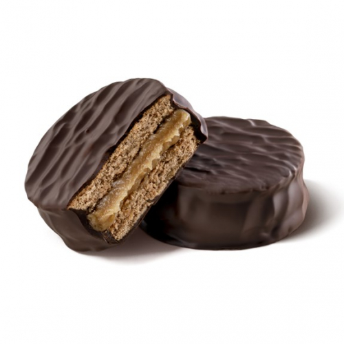 Alfajor cubierto de chocolate 70% cacao, relleno de dulce de leche de almendras y con tapas de harina de trigo sarraceno, directos desde Mar de Plata :)