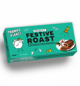 Asadito de 1kg. relleno de una mezcla de setas, castañas y arándanos, con un exterior carnoso de seitán, alubias cannellini, cebada perlada, verduras y hierbas.