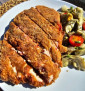 Cachopo Sunshine, elaborado artesanalmente con base de proteína de guisante, queso cremoso de anacardos fermentados y jamón vegano, sin gluten añadido.
