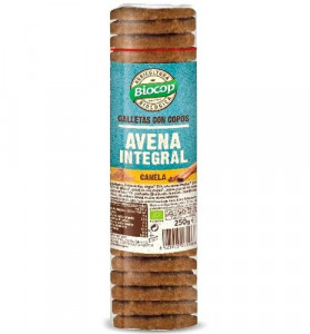 Ingredientes: Harina de TRIGO integral* 35%, copos AVENA integral* 34%, aceite de girasol*, azúcar de cañal*, Jarabe glucosa de maíz*, canela en polvo* 1%, gasificantes (Bicarbonato de amonio, bicarbonato sódico), sal, extracto natural de oliva, aroma natural de vainilla* de agricultura biológica.