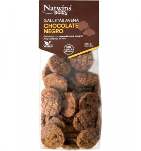 Galletas de copos de avena integral y chocolate negro (8%). Sin azúcar añadido y sin aceite de palma.