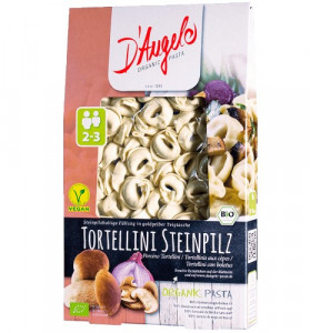 Ingredientes: Pasta: sémola de trigo duro*, agua.II Relleno (26%): pan rallado* (harina de trigo blando*, levadura*), champiñones* (30%), copos de patata*, cebollas*, aceite de girasol*, sal marina, emulsionante: lecitina de soja *, ajo*, pimienta*