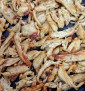 Bocados de seitán hecho de alubias blancas y gluten de trigo estilo pollo con especias y de textura fibrosa y jugosa.