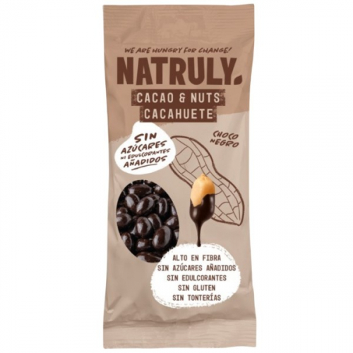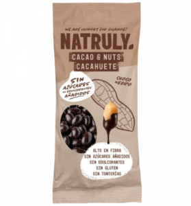 Cobertura de chocolate negro 50% (pasta de cacao, fibra de achicoria, manteca de cacao, emulgente: lecitina de girasol, aroma natural), cacahuete tostado 50%.