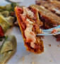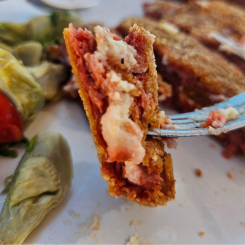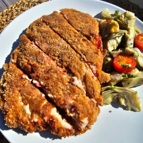 Cachopo Sunshine, elaborado artesanalmente con base de proteína de guisante, queso cremoso de anacardos fermentados y jamón vegano, sin gluten añadido.