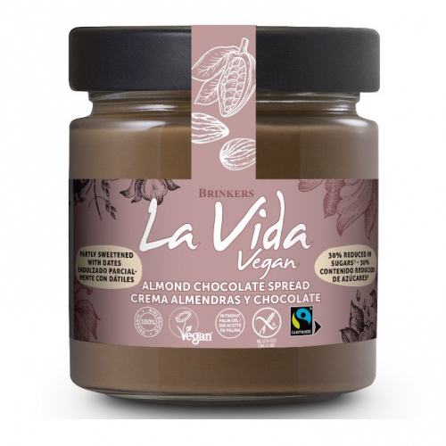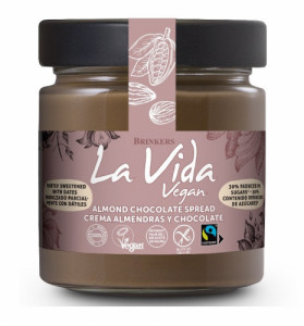 Crema de almendras con chocolate con menos azúcar (contiene un 30% menos de azúcar). Endulzada con dátil.