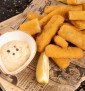 Proteína de soja [agua, proteína de soja texturizada (harina de soja desgrasada (2,4%), gluten de trigo, aislado de proteína de soja (1,2%), almidón de maíz) (6,0%), aislado de proteína des soja (5,0%), gluten de trigo, aceite de soja (3,6%), concentrado de proteína de guisante, trehalosa, azúcar, inulina, sal, extracto de levadura, saborizante, vinagre, especias, espesante (metilcelulosa, goma arábiga), cáscara de semilla de psyllium]( 66,7%), agua, aceite de soja (7,8%), pan rallado (harina de trigo, levadura, sal, enzimas, extracto de pimentón, cúrcuma), preparado para fritura (harina de trigo, almidón de maíz, espesante (almidón modificado, goma xantana), gasificante (bicarbonato de sodio), sal), hierro y vitamina B12.Puede contener trazas de apio, mostaza y sésamo.