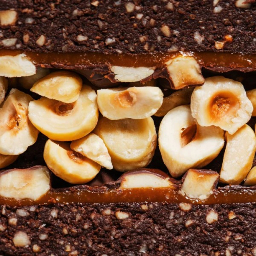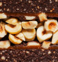 Avellanas (40%), caramelo (19,6%) (extracto de coco, extracto de zumo de manzana concentrado, almidón de maiz), avena sin gluten, glaseado de chocolate (12,2%) (masa de cacao, edulcorante maltitol, manteca de cacao, cacao desgrasado en polvo, emulsionante lecitina, aroma natural de vainilla), cacao en polvo oscuro (7,8%), manteca de cacao, extracto de zumo de manzana concentrado, aceite de coco.