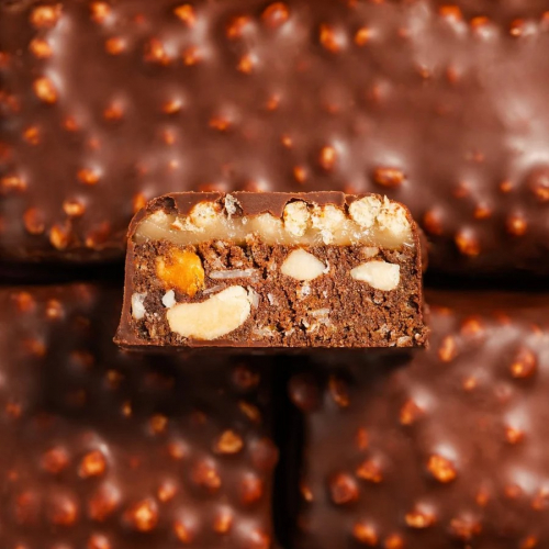 Caramelo (37,3%) (extracto de coco, jarabe de maltitol, almidón de maíz), glaseado de chocolate (16,3%) (masa de cacao, edulcorante maltitol, manteca de cacao, cacao desgrasado en polvo, manteca de karité, emulsionante lecitina, aroma natural a vainilla), cereales crujientes (11,3%) (harina de maíz, harina de amaranto), avena sin gluten, cacahuetes (10%), glicerina vegetal, aislado de proteína de guisante (5%) (contiene un 85% de proteína), fibra de tapioca, cacao en polvo oscuro (3,3%), sal rosa, calcio, magnesio, colina, vitamina C, vitamina E, vitamina B6, vitamina A, vitamina B9, vitamina D3, vitamina B12.