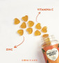 Vitamina C y Zinc que ayudan al funcionamiento del sistema inmune, mejorando la función antioxidante y la salud celular, sabor a naranja, sin azúcar ni gluten.