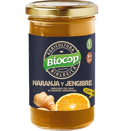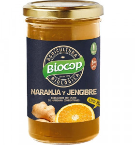 Mermelada de naranja con jengibre. Elaborada con naranjas maduras mediante cocción mínima para garantizar todo el sabor y aroma de la fruta. Endulzado con concentrado de zumo de manzana.