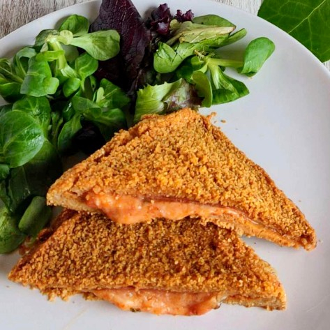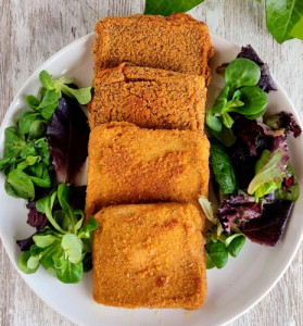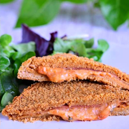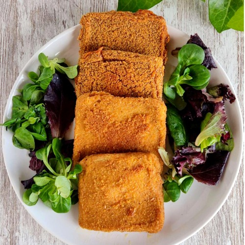 Cachopo vegetal con jamón ahumado, queso mozzarella y salsa Portofino (tomate y albahaca). En tamaño mini para comer del tirón.