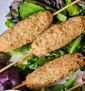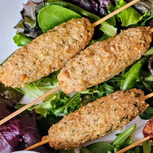 Jugosas y "carnosas" brochetas de origen vegetal a base de proteína de guisante, con adobo de ras el hanout, al más puro estilo árabe.