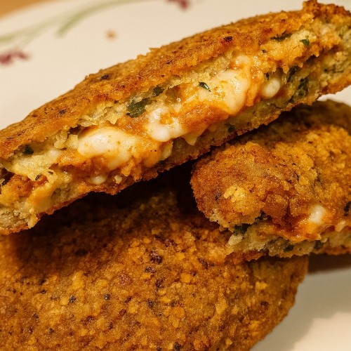 Filetes de proteína de guisante estilo filete ruso, relleno de loncheado tipo queso cheddar y tipo york. Una propuesta sabrosa, suave y extremadamente jugosa.