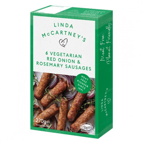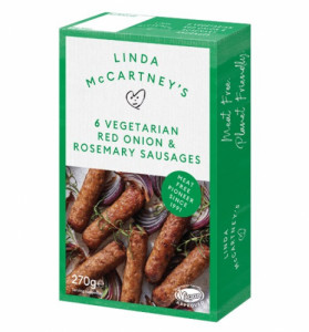 Salchichas de Linda McCartney, con Cebolla Roja y Romero, deliciosas al horno o a la plancha.