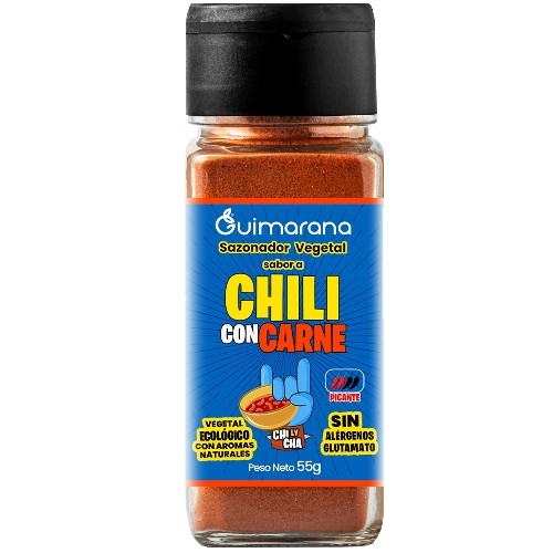 Sazonador vegetal y ecológico sabor Chili con Carne. Da todo el sabor a tus recetas con este condimento, sin gluten, sin alérgenos y totalmente vegano.