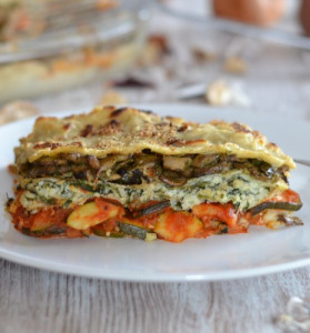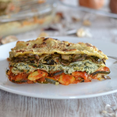 Lasaña rellena de setas, espinacas, salsa de tomate con calabacín y gratinada con bechamel vegetal. Producto ya horneado, listo tras un calentamiento.