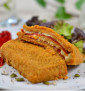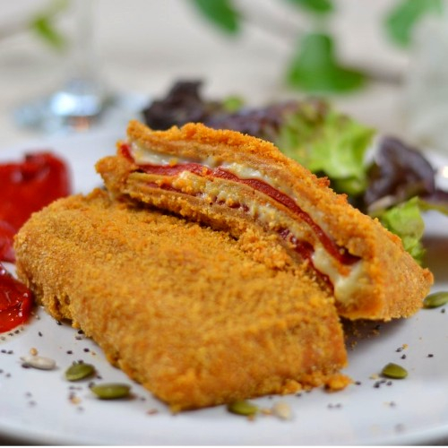 Cachopo de pimientos del piquillo rellenos de cremosa bechamel al queso azul con trocitos de veggievacon rebozado con un crujiente empanado.
