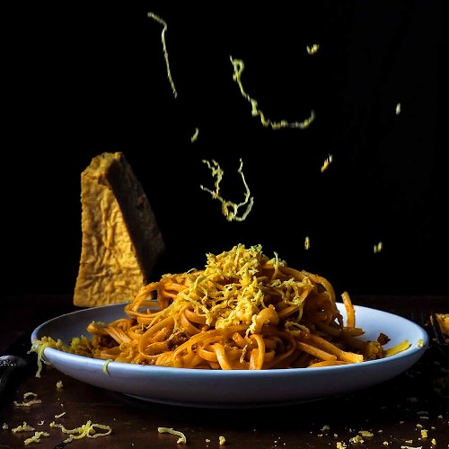 Queso vegetal estilo parmesano a base de altramuz, anacardos, almendras y fermentos, ideal para gratinar y rallar.
