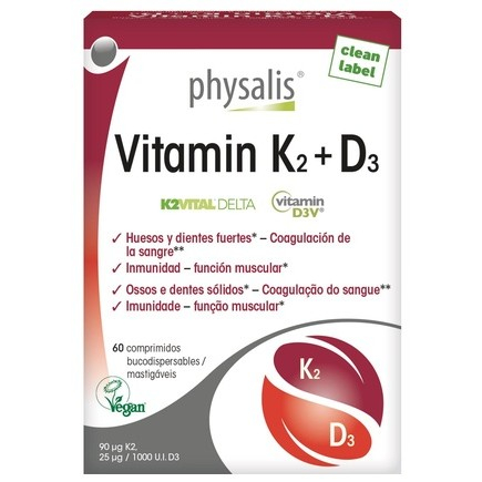 Vitamina K2 + D3 contiene 60 comprimidos de Vitamina D3 vegana, obtenida de algas (Vitamina D3V) y Vitamina K2.